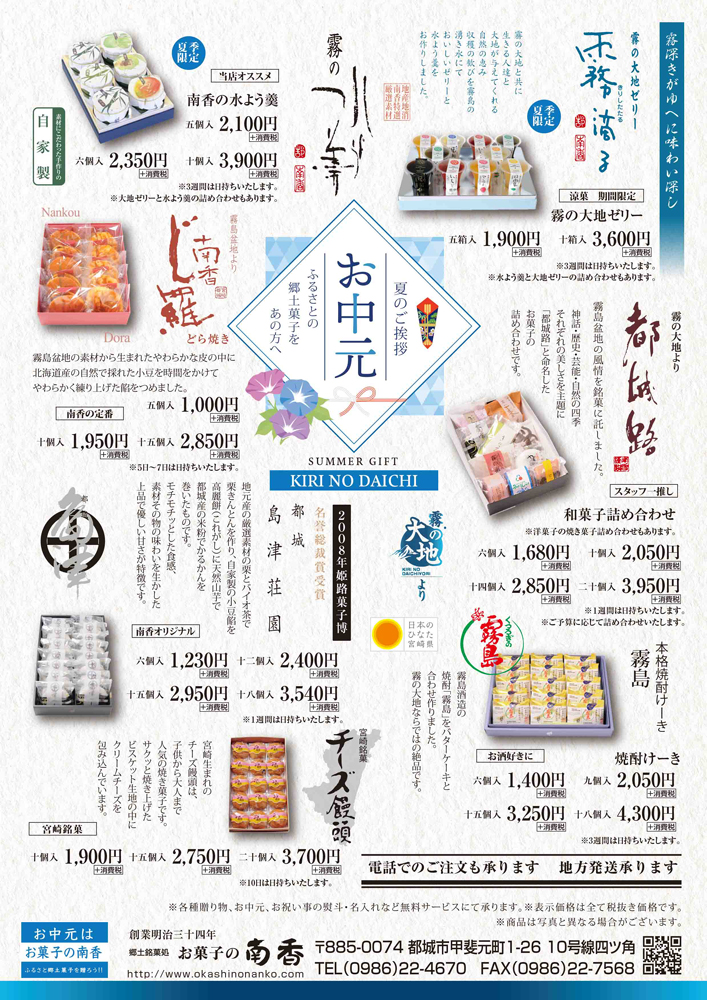 お中元・夏の贈り物 2025年6月20日 ふるさと郷土菓子を贈ろう!! 会社でお世話になった方へは大地ゼリーや水よう羹、 故郷を離れて暮らす友人へは和菓子の詰め合わせやチーズ饅頭、 両親には、どら焼きや島津荘園など! お酒の好きな方へは焼酎けーき。 夏のご挨拶やお土産にもぴったりのお菓子を取り揃えています。 各種贈り物、お中元、お祝い事の熨斗・名入れなど 無料サービスにて承ります。