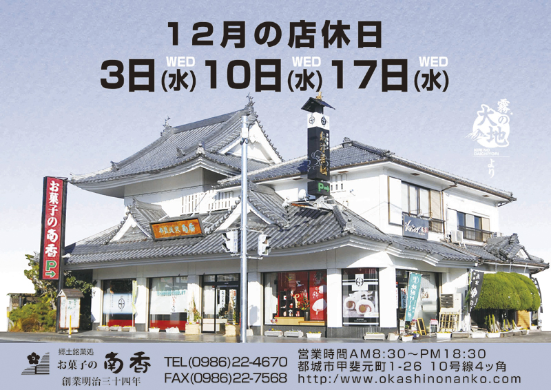 12月3日、10日、17日は店休日のお知らせ 2025年12月1日 いつもお菓子の南香をご利用いただき誠にありがとうございます。 12月3日(水)・10日(水)・17日(水)店休日とさせていただきます。 お客様にはご不便とご迷惑をお掛けいたしますが、 ご了承の程、よろしくお願いいたします。